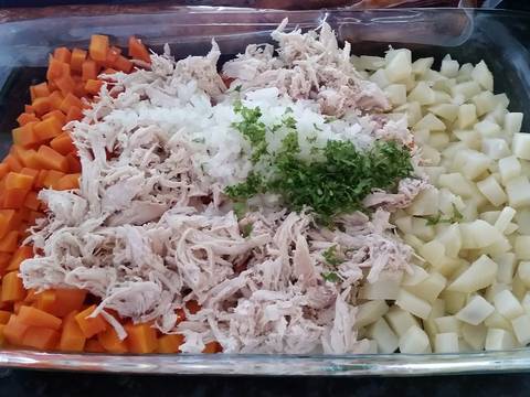 1/2 kg zanahorias1/2 kg papas1 pechuga de pollo pequeña1 cebolla pequeña1 ramito cilantro3 ajos2 cucharadas mayonesa1 cucharadita mostazaal gusto Sal1 lata guisantes verdes (opcional)Pasos