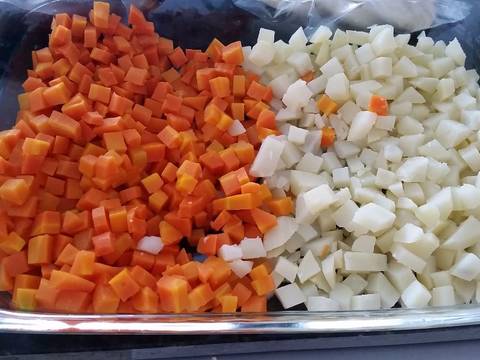 Cortar las papas y zanahorias en cubos de menos de 1cm. Hervir por separado en el caldo que quedó del paso anterior para que sea mas gustosa la ensalada. Si lo prefiere hervir solo en agua con un poco se sal.